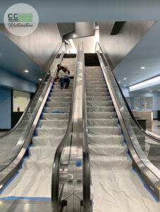 Removing graffiti scratches from glass panels that line the escalators at the TCL Chinese Theatre in Hollywood Ca.