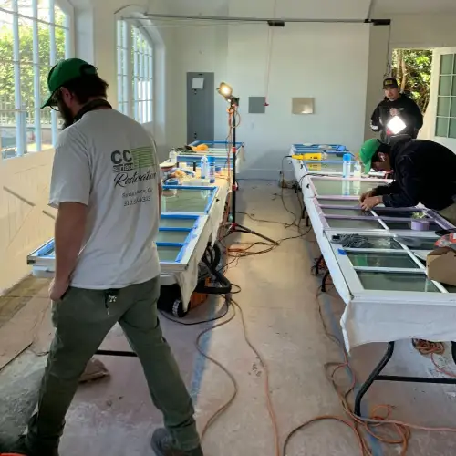 A professional restoration process that removes construction-related damage—razor tracks, mineral debris scours, suction-cup trails, weld spatter, and light etching—returning glass to clear, uniform appearance without replacing the pane.
